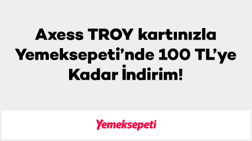 Axess TROY kartınızla hafta sonları Yemeksepeti'nde yapacağınız 500 TL ve üzeri harcamanızdan TROY100 kodunu kullanarak 100 TL indirim fırsatı.