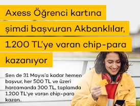 - Chip-para kampanyasına Axess, Wings, Free, Akbank Kart ve Ticari kartlar ile bu kartlara bağlı ek kartlar ve sanal kartlar kampanyaya dahildir. Bank’O Card Axess kartlar kampanyaya dahil değildir.