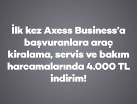 İlk kez Axess Business kredi kartı sahibi olarak 30 Nisan’a kadar yapacağınız toplamda 30.000 TL ve üzeri araç kiralama, servis ve bakım harcamalarınızda 4.000 TL indirim kazanabilirsiniz.